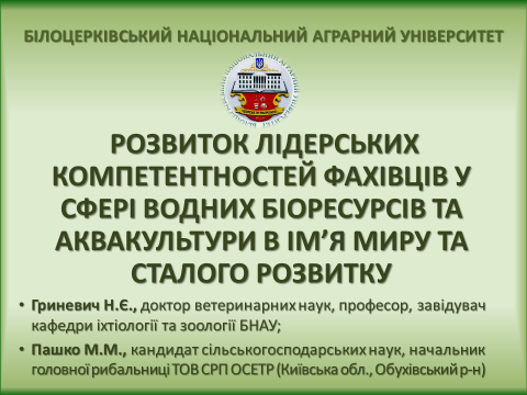 Представлення теми «Розвиток лідерських компетентностей фахівців у сфері водних біоресурсів та аквакультури в ім’я миру та сталого розвитку» Гриневич Наталією Євгеніївною, професором, доктором ветеринарних наук, завідуючою кафедри іхтіології та зоології БНАУ та Пашко Мариною Михайлівною, кандидатом с.-г. наук, начальником головної рибальниці ТОВ СРП ОСЕТР (Київська обл., Обухівський р-н), яка доєдналася до Марафону онлайн ствердила, що лише спільною і злагодженою діяльністю держави і бізнесу, науки і підготовки висококваліфікованих фахівців можна досягти не лише розвитку, а й успіху в галузі аквакультури.