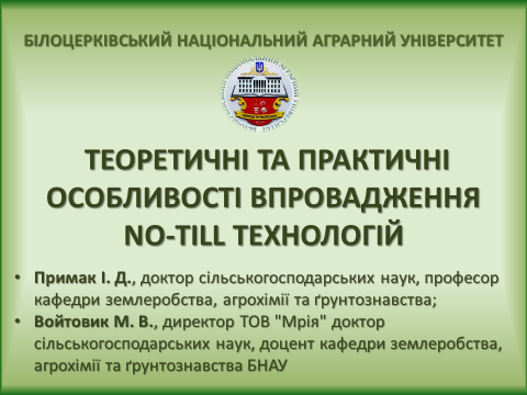 На Агробіотехнологічному факультеті, безпосередньо Кафедра землеробства, агрохімії та ґрунтознавства проводить дослідження, розробляє та надає наукове обґрунтування технологіям вирощування сільськогосподарських культур у Nо-Till системах землеробства. Цікаво, – ці технології мають переваги, чи навпаки недоліки? Щоб почути відповіді на такі запитання та мати довіру до наукових розробок до розмови були запрошені: професор кафедри землеробства, агрохімії та ґрунтознавства, доктора с. – г. наук – Примак Іван Дмитрович та Войтовик Михайло Вікторович, доктор с.-г. наук, доцент кафедри землеробства, агрохімії та ґрунтознавства БНАУ й директор ТОВ “Мрія”, де використовуються технології Nо-Till.