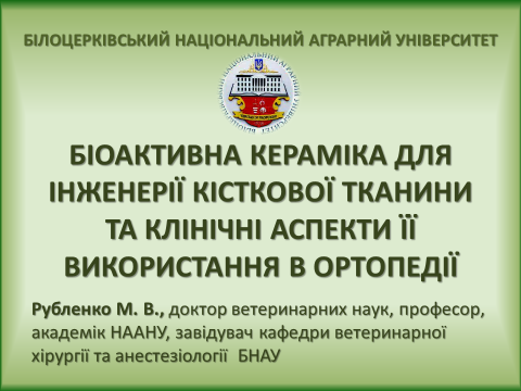Саме такі, надзвичайно необхідні нашому суспільству дослідження з відновлення кісткових дефектів, що виникають при травмах, операціях або захворюваннях з використанням нових технологій, проводяться у співпраці з вченими НАН України – молодими науковцями Кафедри ветеринарної хірургії та анестезіології Факультету ветеринарної медицини під керівництвом її завідувача, доктора ветеринарних наук, професора, академіка НААН України Михайла Васильовича Рубленка.