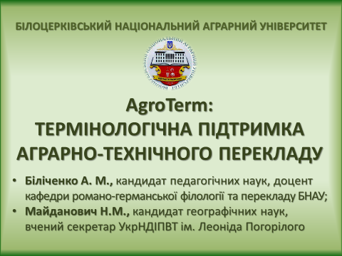 З темою: «AgroТеrm: термінологічна підтримка аграрно-технічного перекладу» аудиторію ознайомили – Біліченко Алла Миколаївна, кандидат педагогічних наук, доцент кафедри романо-германської філології та перекладу БНАУ та Майданович Надія Миколаївна, кандидат географічних наук, вчений секретар Українського науково-дослідного інституту прогнозування та випробовування техніки та технологій для сільськогосподарського виробництва імені Леоніда Погорілого.