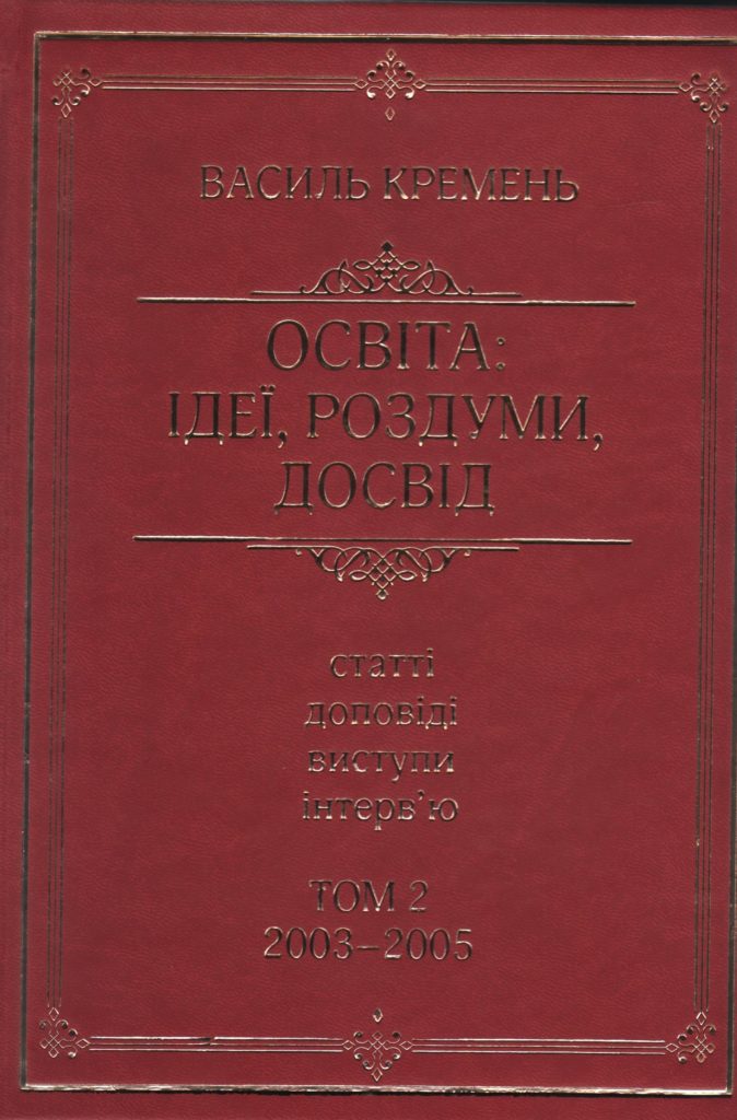 Кремень В. Освіта: ідеї, роздуми, досвід: Статті, доповіді, виступи, інтерв’ю / зібрання тв. у п’яти томах : Т. 2. 2003 – 2005. – Київ : Грамота, 2025. – 400 с.
