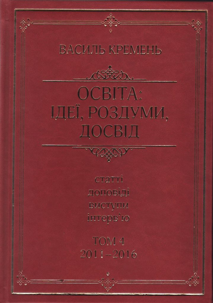 Кремень В. Освіта: ідеї, роздуми, досвід: Статті, доповіді, виступи, інтерв’ю / зібрання тв. у п’яти томах : Т. 4. 2011 – 2016. – Київ : Грамота, 2025. – 392 с.