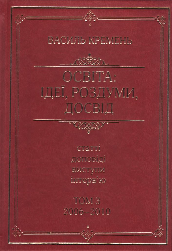 Кремень В. Освіта: ідеї, роздуми, досвід: Статті, доповіді, виступи, інтерв’ю / зібрання тв. у п’яти томах : Т. 3. 2006 – 2010. – Київ : Грамота, 2025. – 392 с.