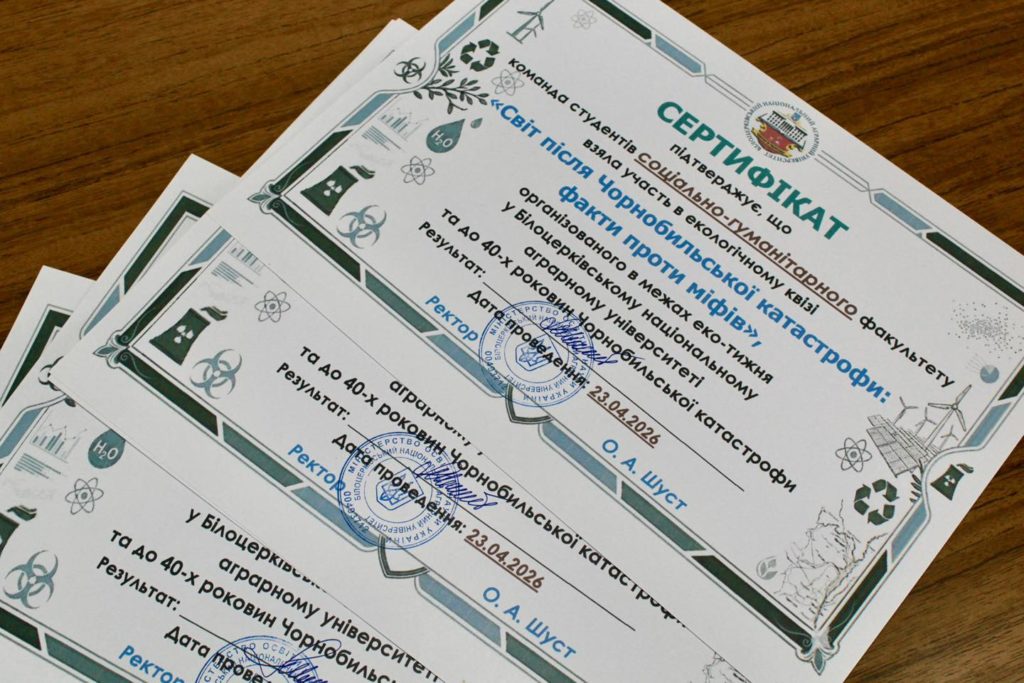 23 квітня 2026 р. студенти Білоцерківського національного аграрного університету взяли участь у екологічному квізі «Світ після Чорнобильської катастрофи: факти проти міфів», організованого до 40-х роковин Чорнобильської катастрофи галузевим відділом наукової бібліотеки. У інформаційному протиборстві зійшлися команди від усіх факультетів університету, засвідчивши високий рівень знань, здатність аналізувати факти та критично оцінювати інформацію.